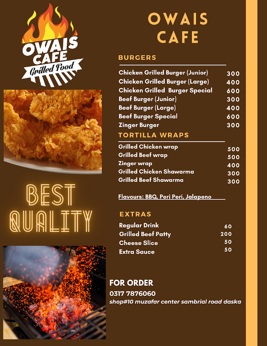 For inquiries, you can reach them at +92 317 7876060. Discover the joy of grilled food today at Owais Cafe!